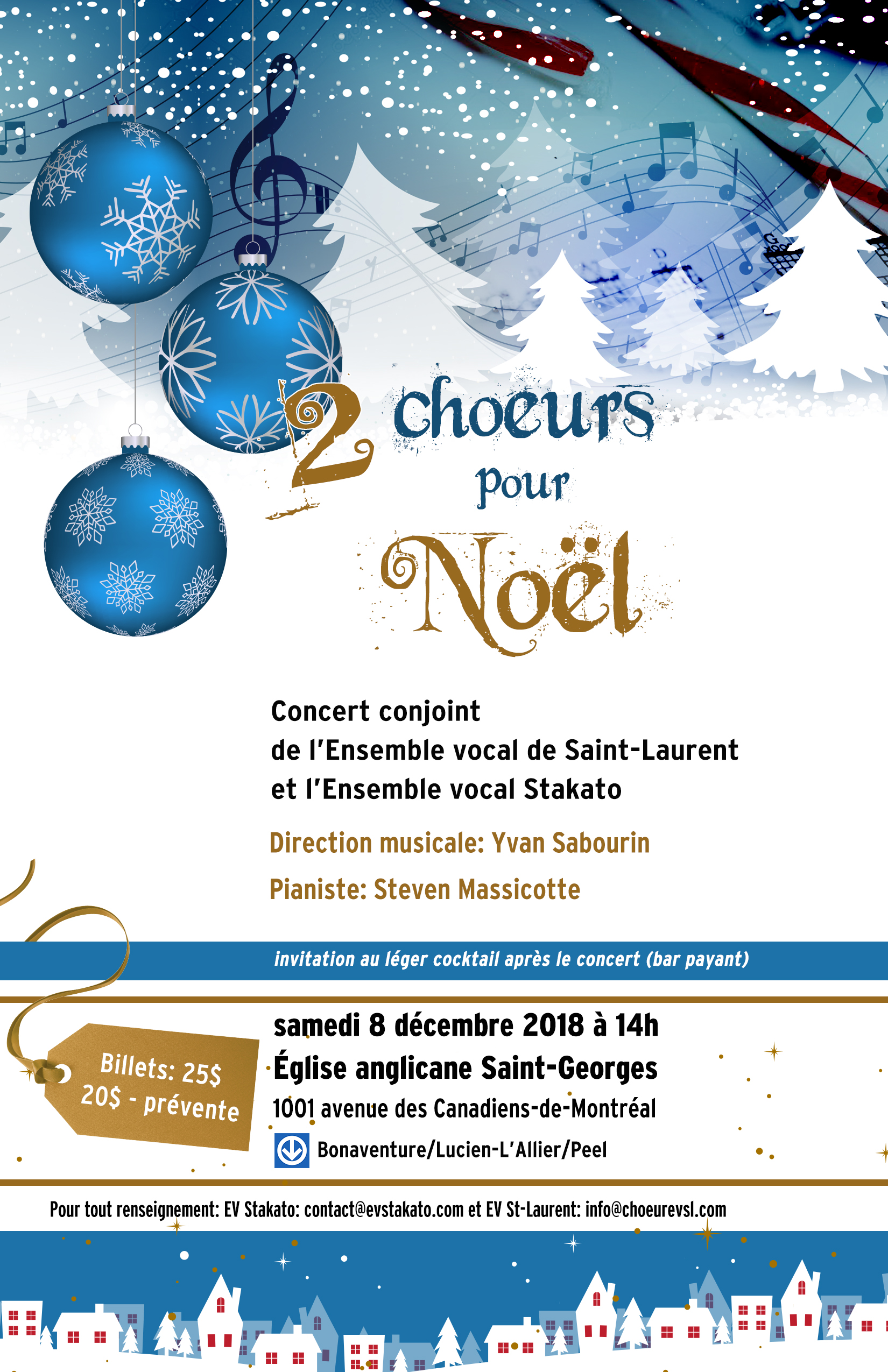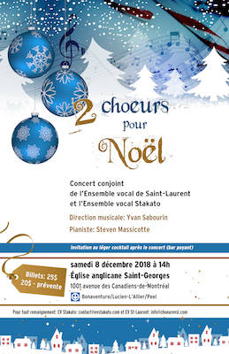 Les ensembles vocaux Stakato et de St-Laurent, sous la direction de monsieur Yvan Sabourin et accompagnés au piano par monsieur Steven Massicotte, vous invitent à leur concert de Noël.